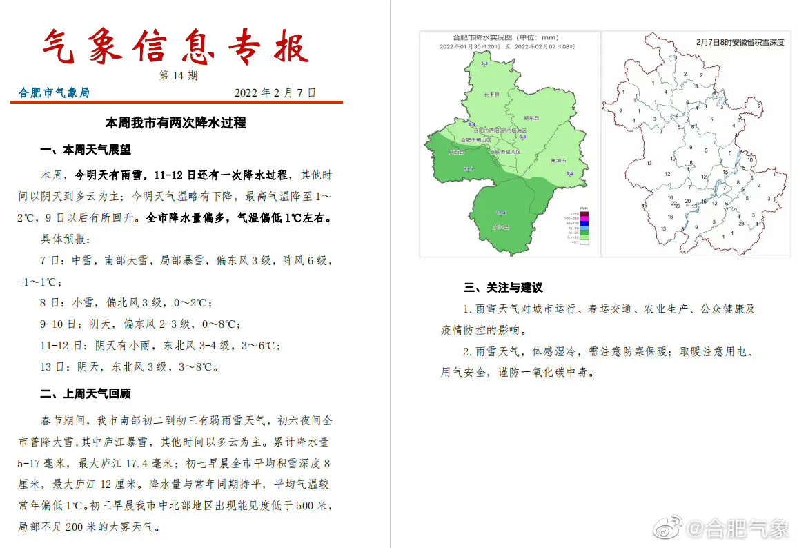 本周,今明天有雨雪,11-12日还有一次降水过程,其他时间以阴天到多云为主;今明天气温略有下降,最高气温降至1~2℃,9日以后有所回升。全市降水量偏多,气温偏低1℃左右。