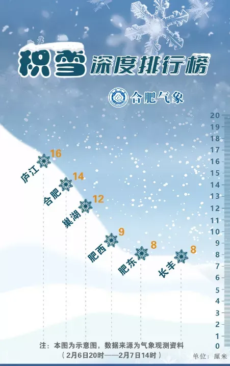 7日11-14时,降雪量2-6毫米;积雪深度(厘米):合肥14,肥东8,肥西9,长丰8,庐江16,巢湖12。