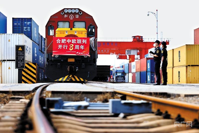 6月24日,一列满载货物发往欧洲地区的合肥中欧班列从合肥北站物流基地驶出。央广网发 解琛摄