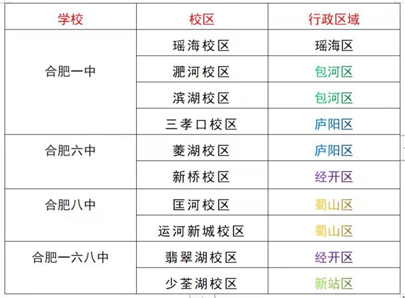 合肥一中(4个):瑶海校区、淝河校区、滨湖校区、三孝口校区。