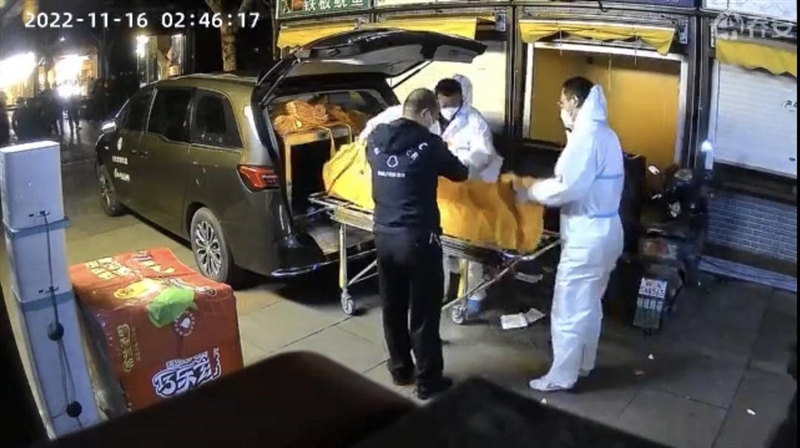 紫牛新闻记者获取到的一份监控视频显示,11月16日凌晨2点45分左右,有身穿白色防护服的人员从涉事小商铺内,用黄色袋子将疑似尸体的物体打包装进配有专业设备的车中。有店铺老板称,确实在前天就有听到消息,17日那天是法警过来勘查现场。