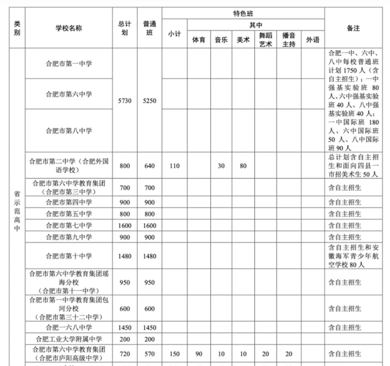 从公布的计划可以看出,今年合肥一中、六中、八中教育集团内的成员校均是单列计划,独立招生。2021年合肥市继续将市区省示范高中招生计划的 85%按照各初中实际就读满三年的毕业年级学生数,按比例分解到市区各初中学校。