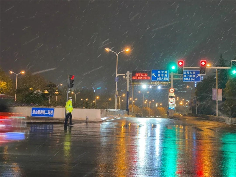 12月16日晚,在合肥南二环,交警顶风冒雪指挥交通,保障市民出行安全。