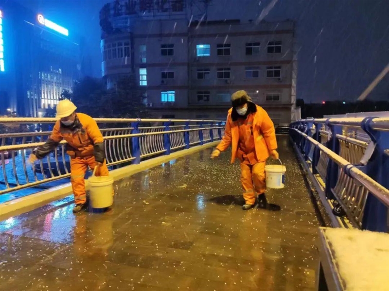 高新区城管局分片区对西二环路与黄山路交口人行天桥、方兴大道和云飞路人行天桥等,采用人工布撒融雪剂,重点路段采用机械撒布融雪剂,全力保障市民出行安全。