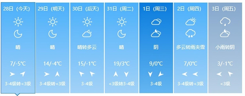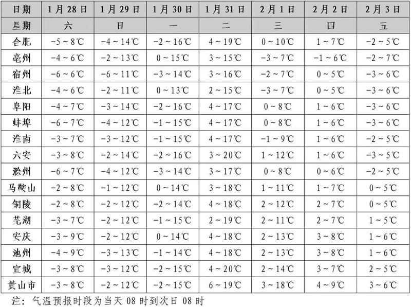 气温方面。1月28-31日全省气温明显回升,其中31日最高气温淮北地区15~18℃;淮河以南17~19℃,局部可达20℃。