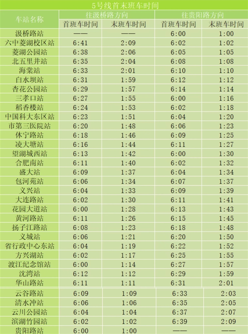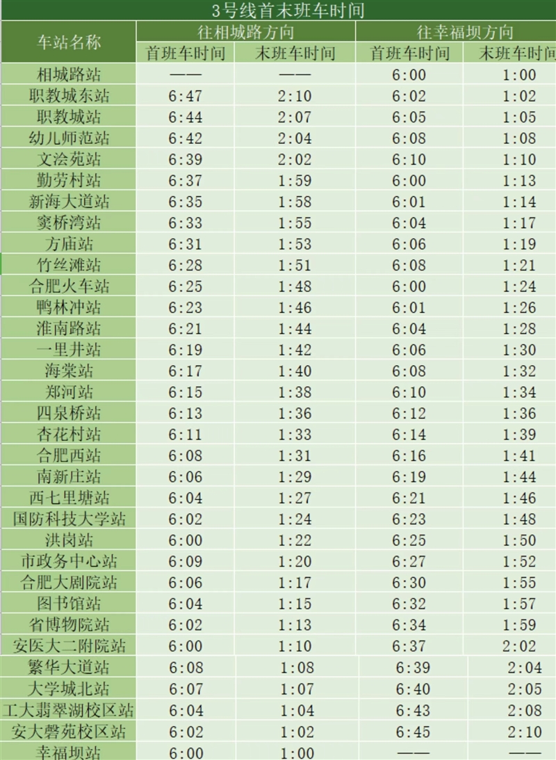 2月3日,记者从合肥市轨道集团获悉,为进一步保障元宵节当天市民乘客安全高效出行,结合开学返程的需求,合肥轨道从行车组织、客运服务、设备保驾等方面提前部署并延长运营时间。2月5日,线网各线路两端站末班车发车时间延后至次日01:00,各线路高峰时段及行车间隔均保持不变。温馨提示:请乘客提前安排好出行,如有需要可拨打服务热线62076666。
