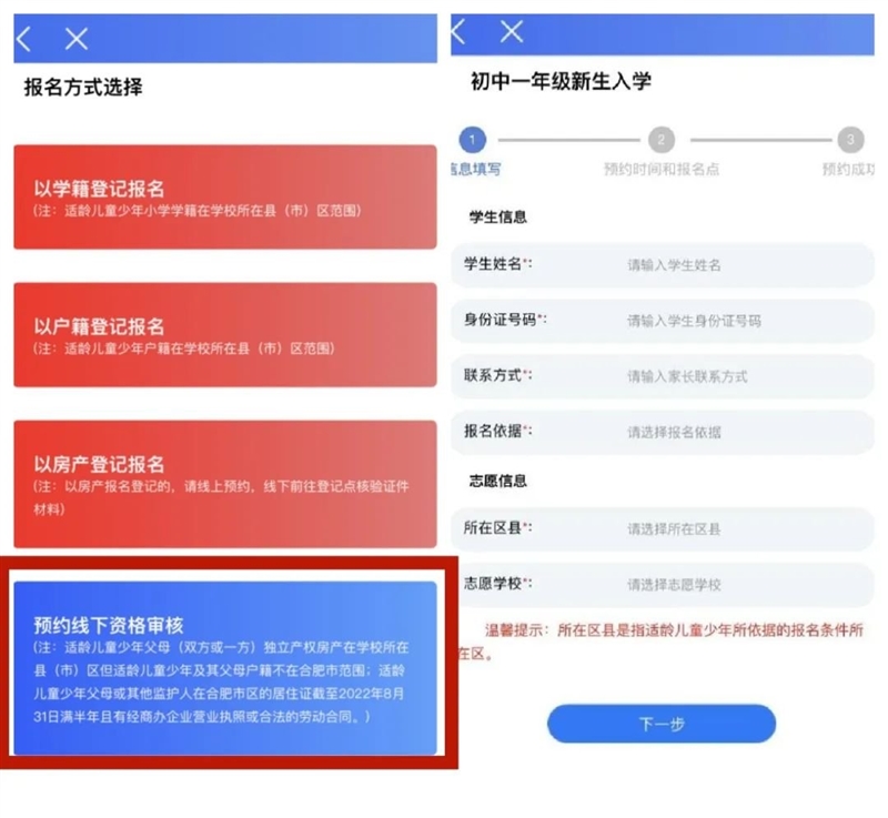 不满足户籍等在线报名条件时,点击“预约线下资格审核”预约线下审核材料,填写相关信息,并确保信息真实有效(注:预约成功后不可修改或取消预约)。其中“志愿学校”仅为意愿的学校,最终以线下审核结果为准,选择报名点时,建议根据房产、居住证或其他材料所属的县区选择报名点就近进行线下材料核验。