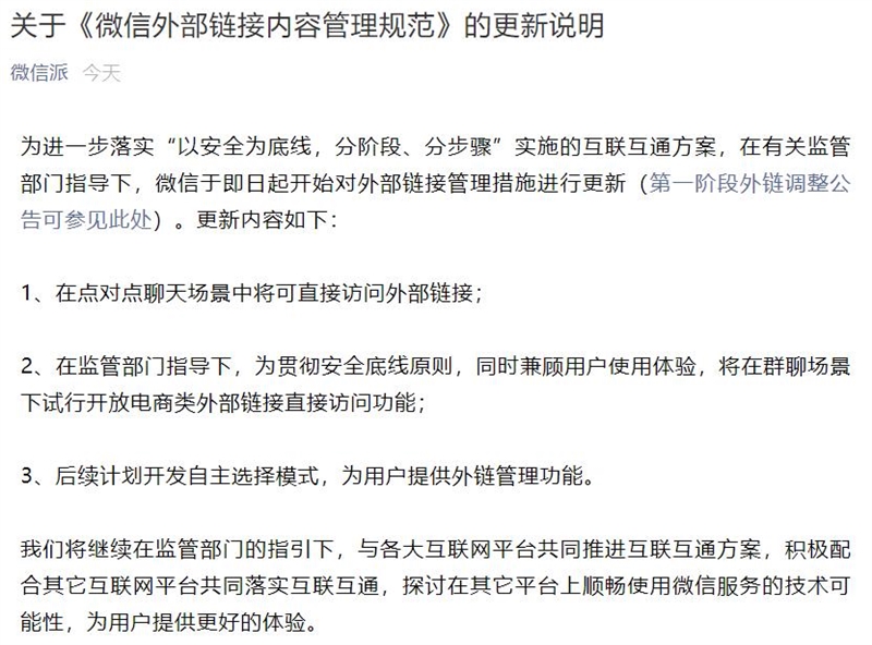 这一声明为微信在“互联互通”背景下对外链规范的进一步升级。9月17日,微信曾发布《关于〈微信外部链接内容管理规范〉调整的声明》,开放了一对一聊天场景中访问外部链接。同时为用户提供自主选择功能,设立外链投诉入口。