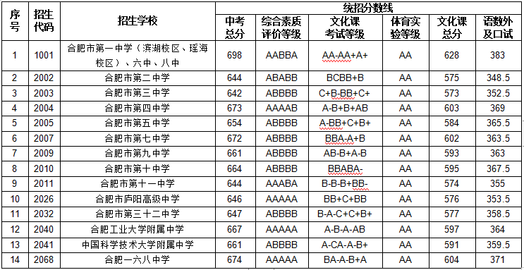 刚刚合肥市教育考试院发布2023年合肥市区普通高中各批次录取最低分数线同时发布合肥一中、六中、八中三校联招统招生录取最低分数线合肥一中(滨湖校区和瑶海校区)、六中、八中三校联招统招线为 698 分合肥